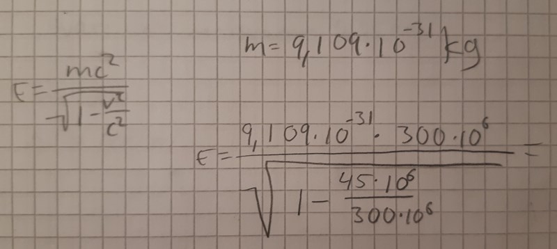I det du skrivit kvadrerar du varken ljusets hastighet eller partikelns hastighet.