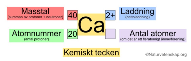 För atomer visas de till vänster om grundämnets bokstäver, som nedsänkt siffra, respektive upphöjd siffra.