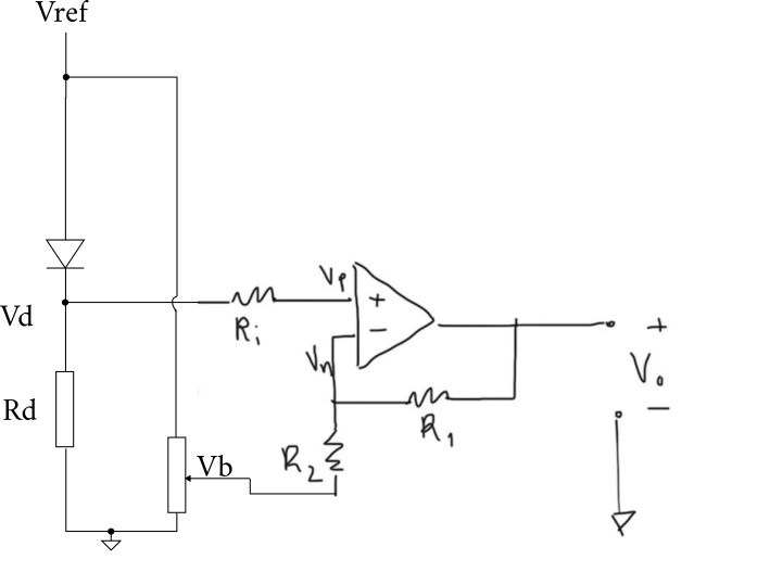 Jag kom att tänka på att spänningen över dioden minskar ju högre temperatur vi har, så jag bytte plats på diod och motstånd (Rd) för att få en ökande insignal, Vd, vid ökande temperatur.