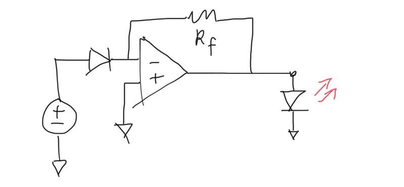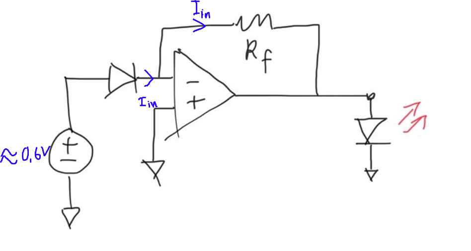 Ovan är en skiss av en helt vanlig ideal VV op-amp. Utsignalen beror endast på de två motstånden, så jag förstår därför inte hur en diod kan påverka. Jag kanske behöver tänka på en icke-ideal förstärkare?