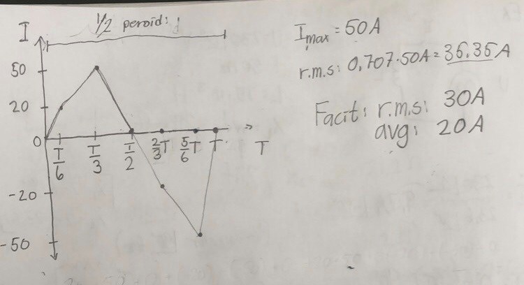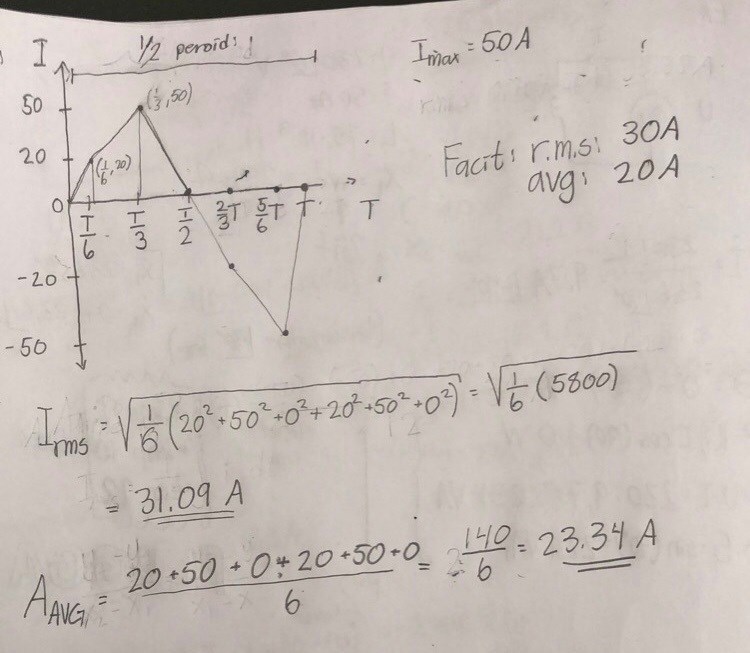 Jag får rms värdet till 31.09 A och I(avg) till 23.34 A. Men i facit har de angett 30 A respektive 20A, har de bara avrundat svaret i facit?