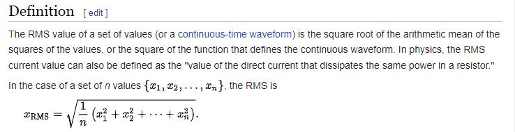 rms betyder root mean square, dvs roten ur medelvärdet av den kvadratiska spänningen.