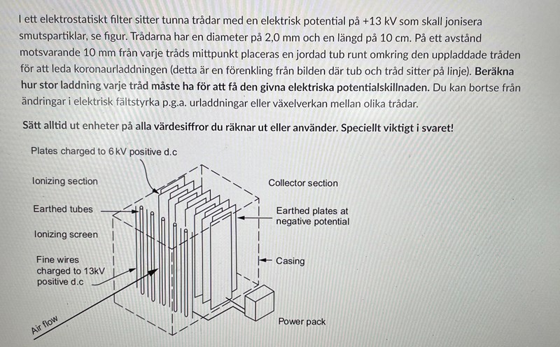Kan någon förklara frågan? Jag förstår inte hur allt hänger ihop. Jag tycker att bilden är otydlig, vad gör de laddade plattorna? (Det nämns inget om de i texten) Är de jordade tuben cylindrarna som ligger mellan trådarna?