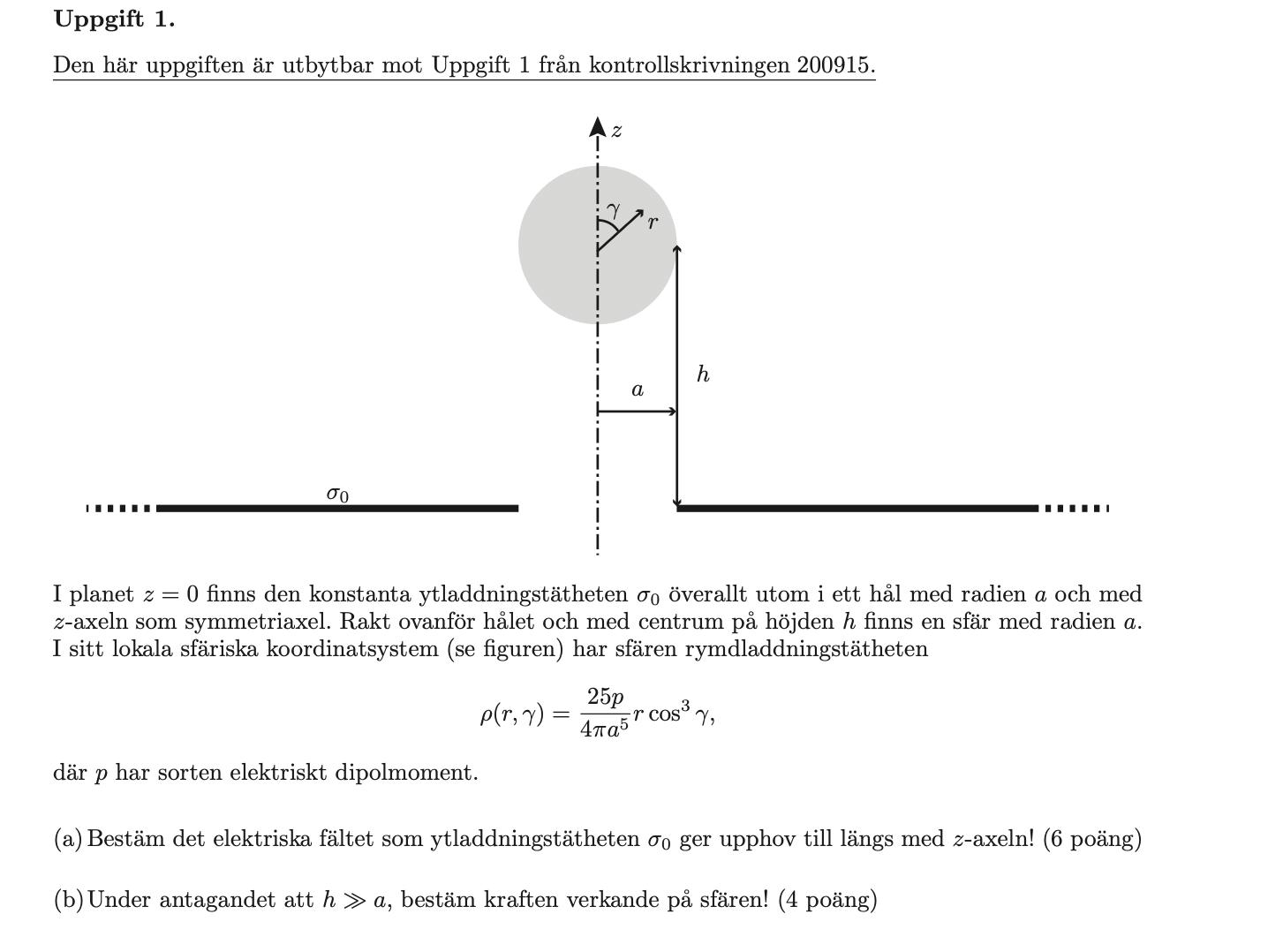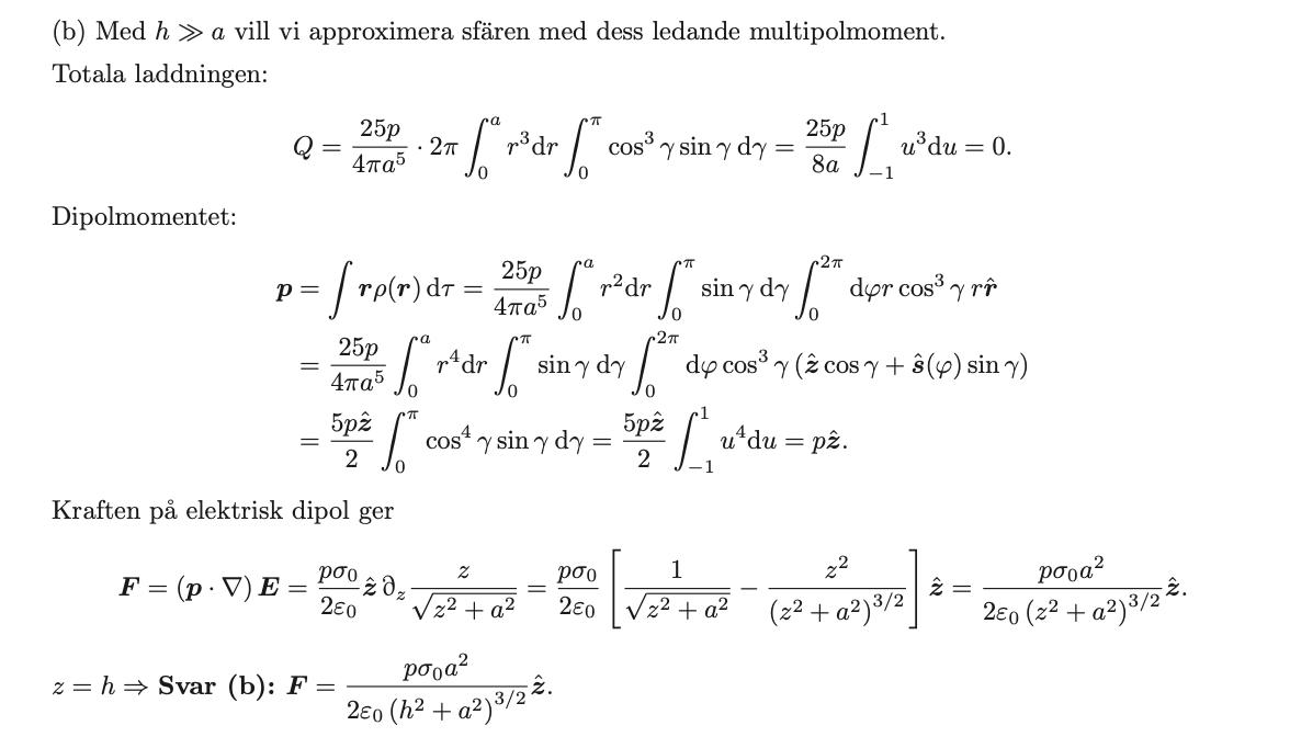 Det elektriska fältet som de använder är elektriska fältet m.a.p z axeln, dvs svaret till upg a. Varför ska man använda det? Då får man ju inte med alla punkter på sfären, är det för att symmetri gäller?