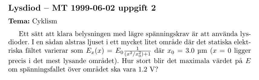 Vad menas med att klara belysningen? Vad är det som ska klara belysningen? Hur klarar man belysningen? Vilken belysning? Vad menas med spänningskrav och hur påverkar en lägre samt högre spänningskrav? Vad betyder alstras och vad är det dom syftar på, lydsioderna? Vad är statiska elektriska fältet? Vad är X(noll)? Varför ska vi ta det mest lysande området? Hur får man reda på det maximala vädet på E samt vilket E? Elektriska fältet E men vilken laddning finns? Vad är ett spänningsfall? Hur ligger ett spänningsfall över ett område, hur ser det ut? Hur skulle man kunna rita allt och veta hur eller vad de pratar om?
