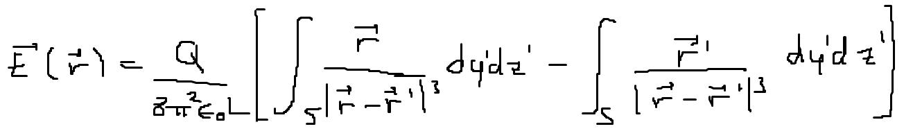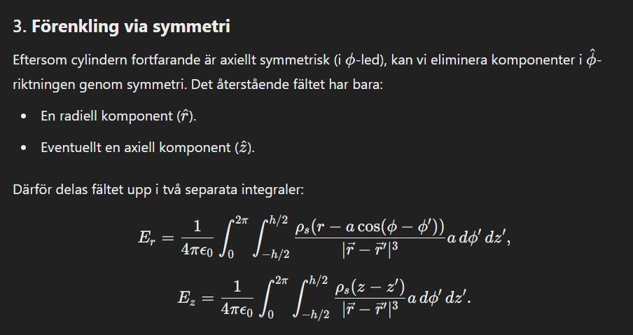 Nedan har jag gjort allt detta. Jag vet att det elektriska fältet endast har radiell riktning, men hur visar jag detta matematiskt? I integralen för det elektriska fältet skalärmultiplicerar jag den infinitesimala ytvektorn med där endast komponenter överlever, men nu har jag inga riktningar kvar...