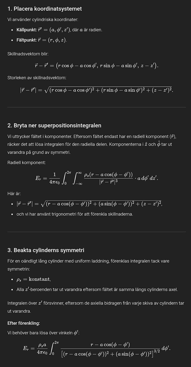SaintVenant skrev:Om cylindern är ändlig kommer fältet inte enbart ha radiella komponenter. Men jag antar att den är oändlig då det annars ofta saknas analytisk lösning på grund av komplexa randeffekter.