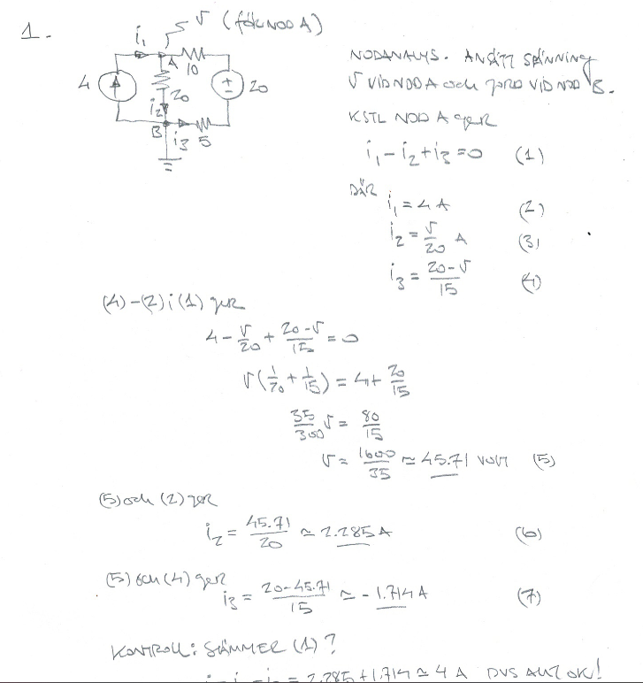 Hej! Jag försöker lösa följande gammla tenta uppgift och hänger med över lag på tänket kring lösningen men förstår inte varför i3 blir (20-v)/15, om man tar spänningen 20-v, borde vi inte dividera med resistansen som ör däremnellan dvs.10 istället för 15?