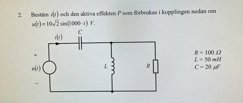 Det är den första biten där man ska beräkna i(t) jag fastnade på. Jag förstår inte riktigt hur vi går ifrån Z=1/j1000*20*10^(-6)+ … osv till det slutgiltiga Z=22,4*e^(-j26,6°).