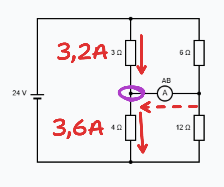 Kirchhoffs strömlag säger att strömmen in i en nod måste vara lika som strömmen ut ur den. Eftersom 3,6 går ut, så måste 3,6-3,2=0,4 gå in genom AB. Alltså från höger till vänster.