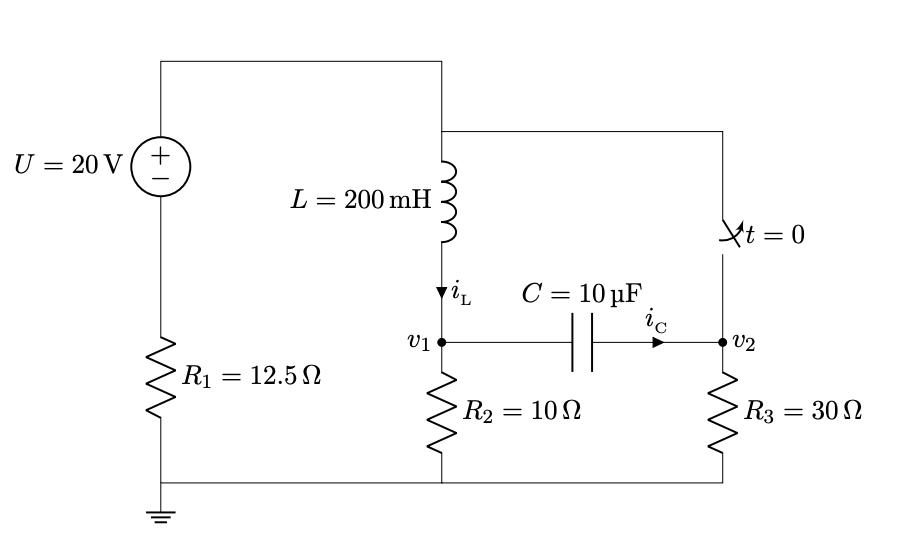 Strömmen genom induktorn innan brytaren aktiveras är densamma som strömmen genom R2. Du har då en likströmskrets, som du lätt beräknar genom att plocka bort kondensatorn och kortsluta induktorn.