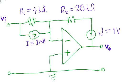 v- och v+ har samma värde i en ideal opamp och här är det 0 då v+ är jordad. Om vi också är jordad så är spänningen över R1 0 och då går ingen ström där. Strömkällan genererar 1mA och eftersom ingången på opamp har en "oändlig" impendans så går all ström genom R2 och ger därmed upphov till ett spänningsfall på 20V. Sen passeras en motkopplad spänningskälla som sänker spänningen 1 V till och summan borde bli - (20+1) = -21V (om spänningsmatningen av opamp'en tillåter det)