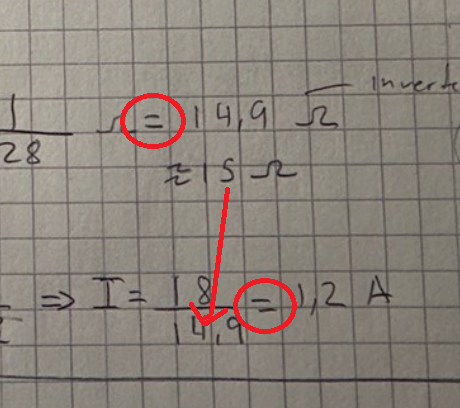 De inringade tecknen är fel. Det är inte =14,9 ohm. Det är inte =1,2 A.