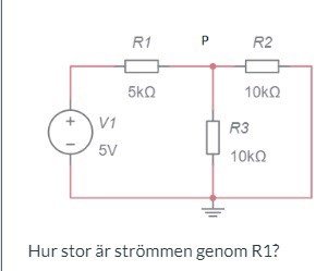 Med hjälp av Ohms lag U = R•I så kan du beräkna strömmen I genom R1.