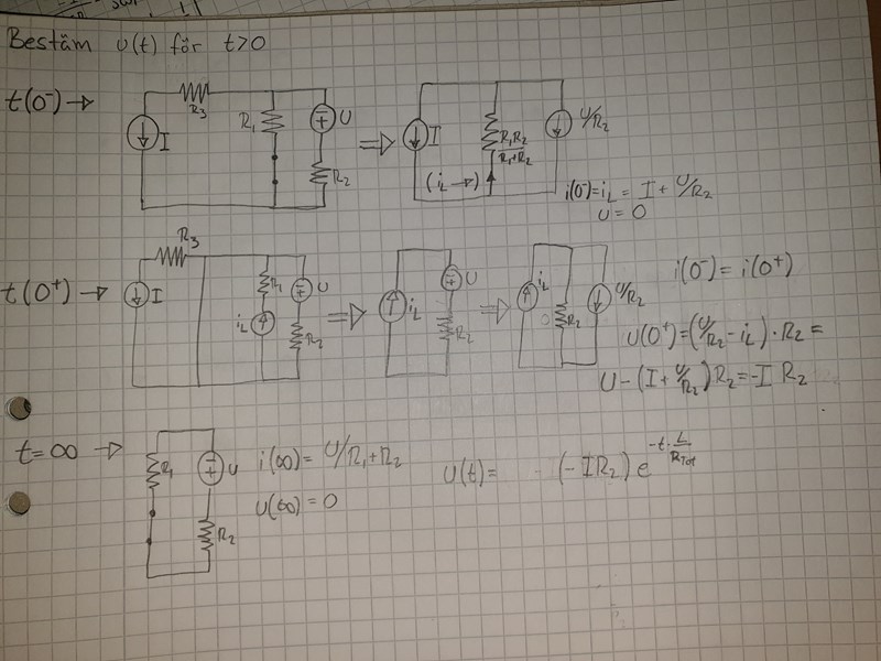 vid t(0+), continuity, beter sig C och L som en spänningskälla respektive strömkälla, här under är mina beräkningar än så länge.