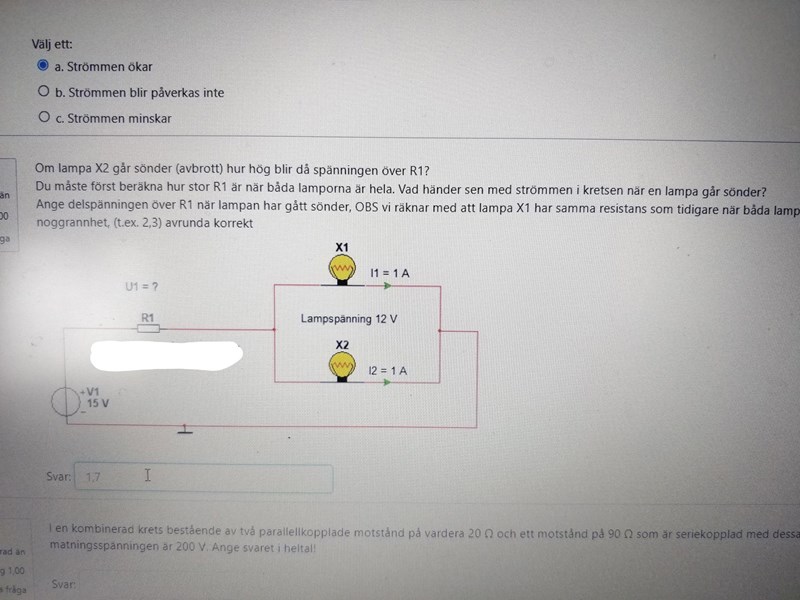 När sen den ena lampan går sönder är den totala resistansen i kretsen 12+1,5 = 13,5 Ohm vilket ger strömmen i kretsen, med Ohms lag, till 15/13,5 A