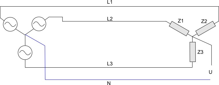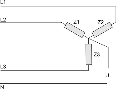 Om Z1=Z2=Z3 blir U=0. Om belastningarna är olika blir U inte noll.