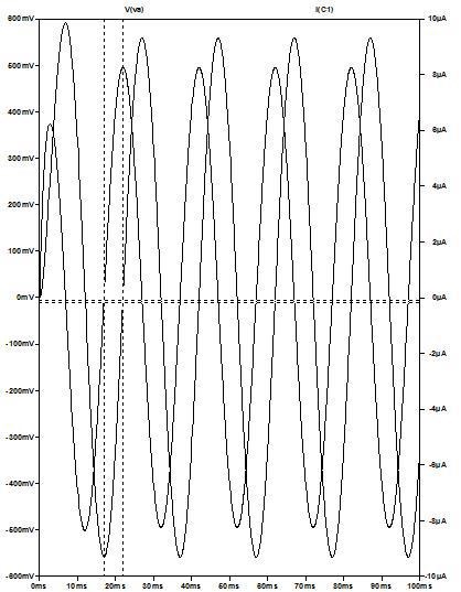 Jag måste ha varit trött när jag skrev inlägget :). Det stämmer arctan(0.3178/0.4596)=34.66, men jag får den fortfarande inte att stämma i LTspice. När jag mäter V(Va) och I(CI) så får jag 5/21.88=0.228 stämmer inte med 34.66/360=0.096. Kanske mäter jag fel i LTspice?