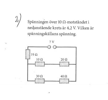 det jag vet är bara sambanden, spänningen över 10 ohm och 20 om är lika med spänningen över 30 ohm och 40 oh. Spänningen över 19ohm + spänningen över 30 och 40 ohm är lika med hela spänningen alltså spänningskällan