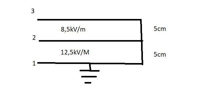Figuren nedan visar tre parallella metallplattor, som begränsar två homogena elektriska fält. Avstånden mellan plattorna är 5 cm. Platta 1 är jordad.