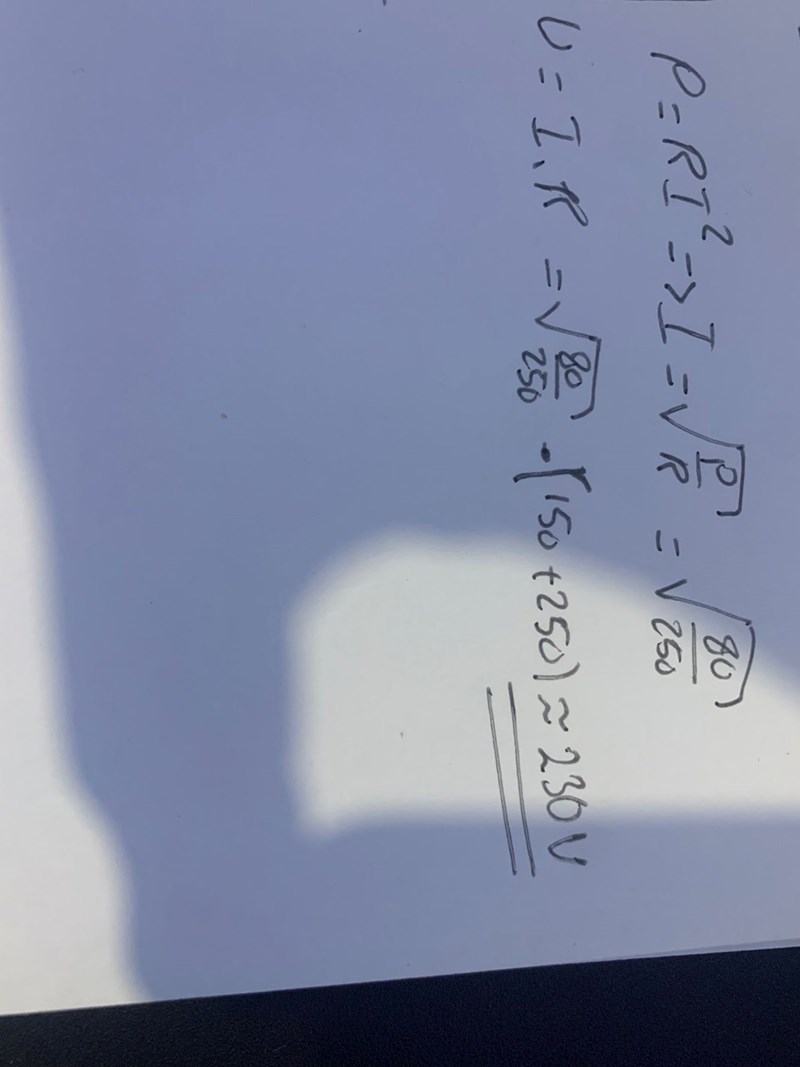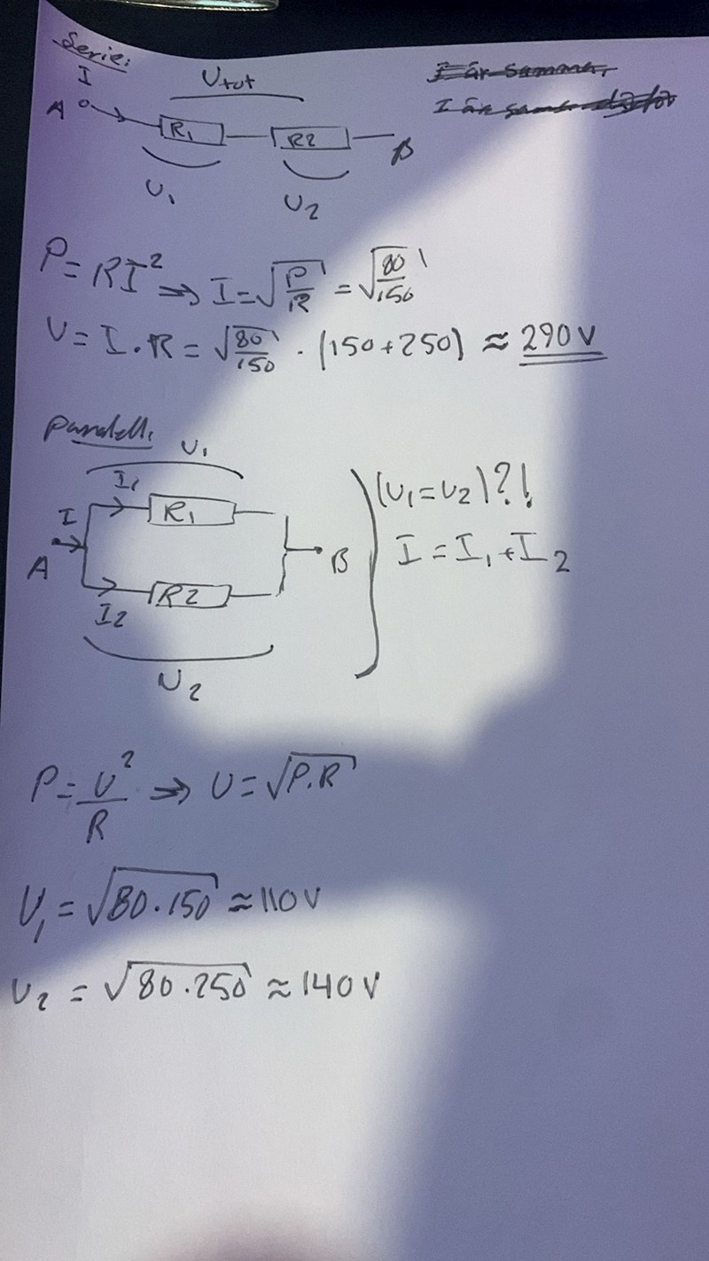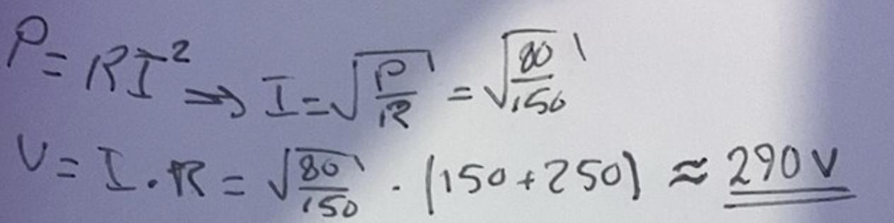 Två resistorer R1 och R2 är seriekopplade. Resistansen hos R1 är 150 och hos R2 är det 250. Var och en av resistorerna får belastas med en effekt högst 80W. Vilken är den största tillåtna spänningen mellan punkterna A och B?