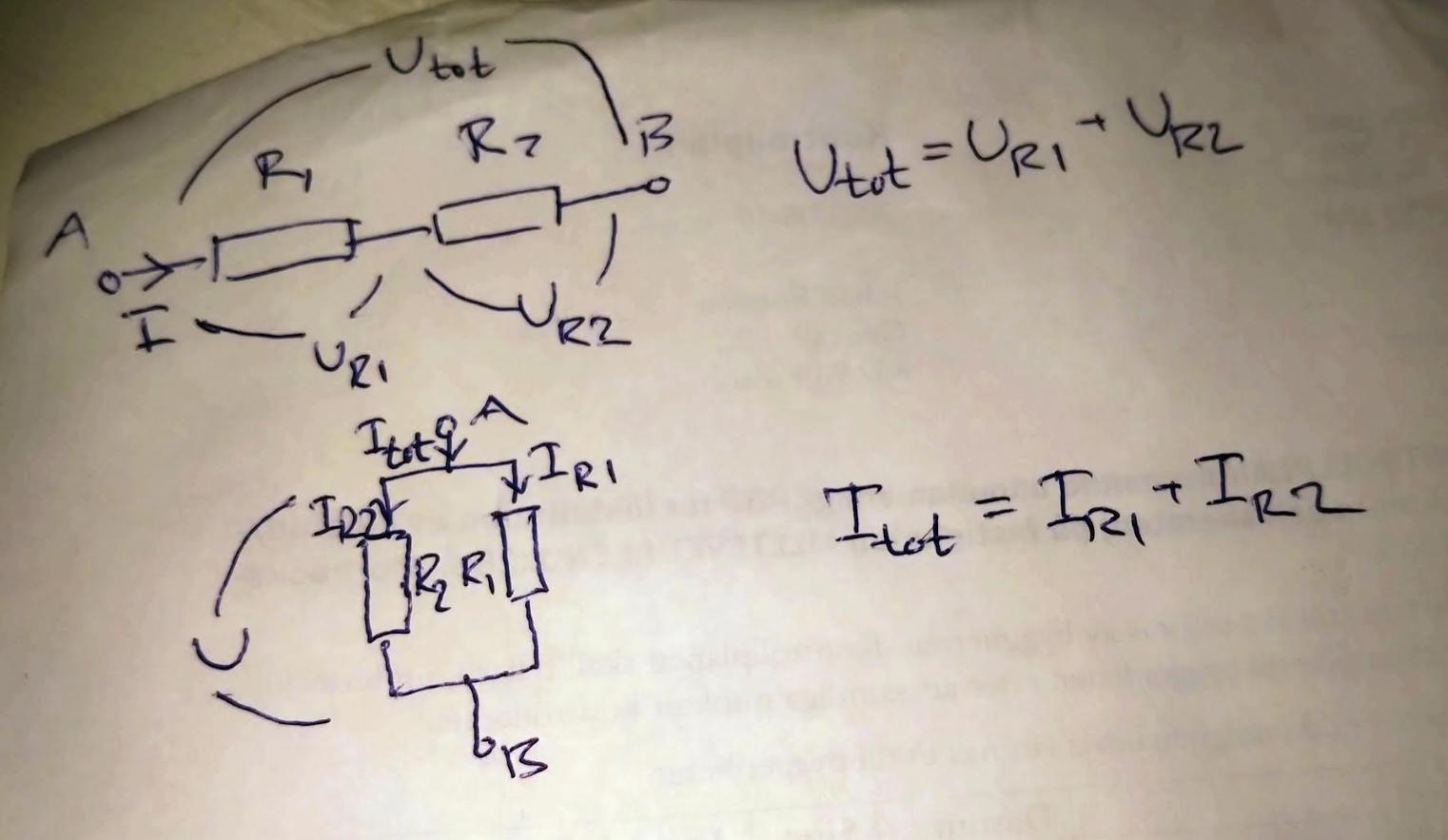 Men nu ser jag lite tydligare vad du frågar efter i TS. Om resistanserna är seriekopplade så kommer samma ström flyta genom dem båda, dvs det finns bara en ström. Utot (dvs spänning mellan A och B) räknas ut genom att summera delspänningarna. Som jag förstår dig så vet du hur du räknar uppgiften i seriekopplingsfallet (annars säg till)