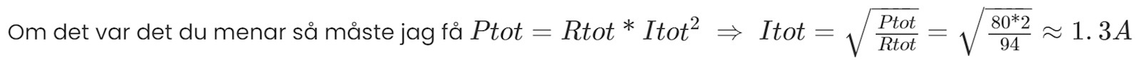 Laguna skrev:Varför behöver du totalströmmen om de är parallellkopplade?