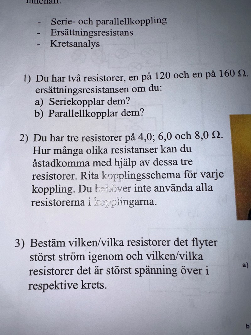 Precis. En koppling Àr att seriekoppla alla, vad ger det för total resistans? En annan Àr att parallellkoppla alla, vad ger det för resistans? Sedan finns nÄgra varianter till.