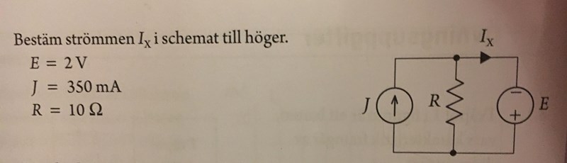 Jag vet att styrkan av Ix bestäms med hjälp av att alla inkommande och utgående strömmar i en nod är lika. Men jag undrar hur jag vet i vilken riktning strömmen går i mittendelen, över resistorn? Jag hade ju gissat på nedåt. Men enligt facit tyder det på uppåt. Ix=550mA.