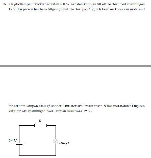 2. Nu ändras spänningen till 24V och du skall koppla in ett motstånd så att 12V kommer på lampan och 12V kommer på motsåndet. Alltså måste motståndet vara lika stort som lampans resistans. Klart.