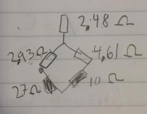 Har redan beräknat strömmen till Ix = 11.6 mA. Vilket stämmer enligt facit. Gjorde då en omvandling "Triangel-stjärn-transformation" eller vad det heter och fick följande krets.