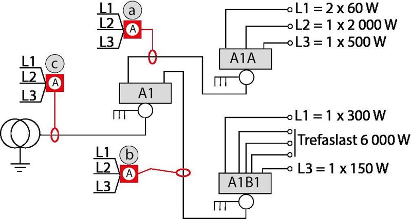 På b) får jag till L2 (trefaslasten) genom att använda formeln: I=P / 1.73 x UH = 6000/ 1,73 x 400 = 8,67A