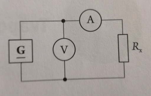 Du glömmer resistansen i amperemetern. Voltmetern är parallellkopplad med amperemetern och Rx (som är seriekopplade).