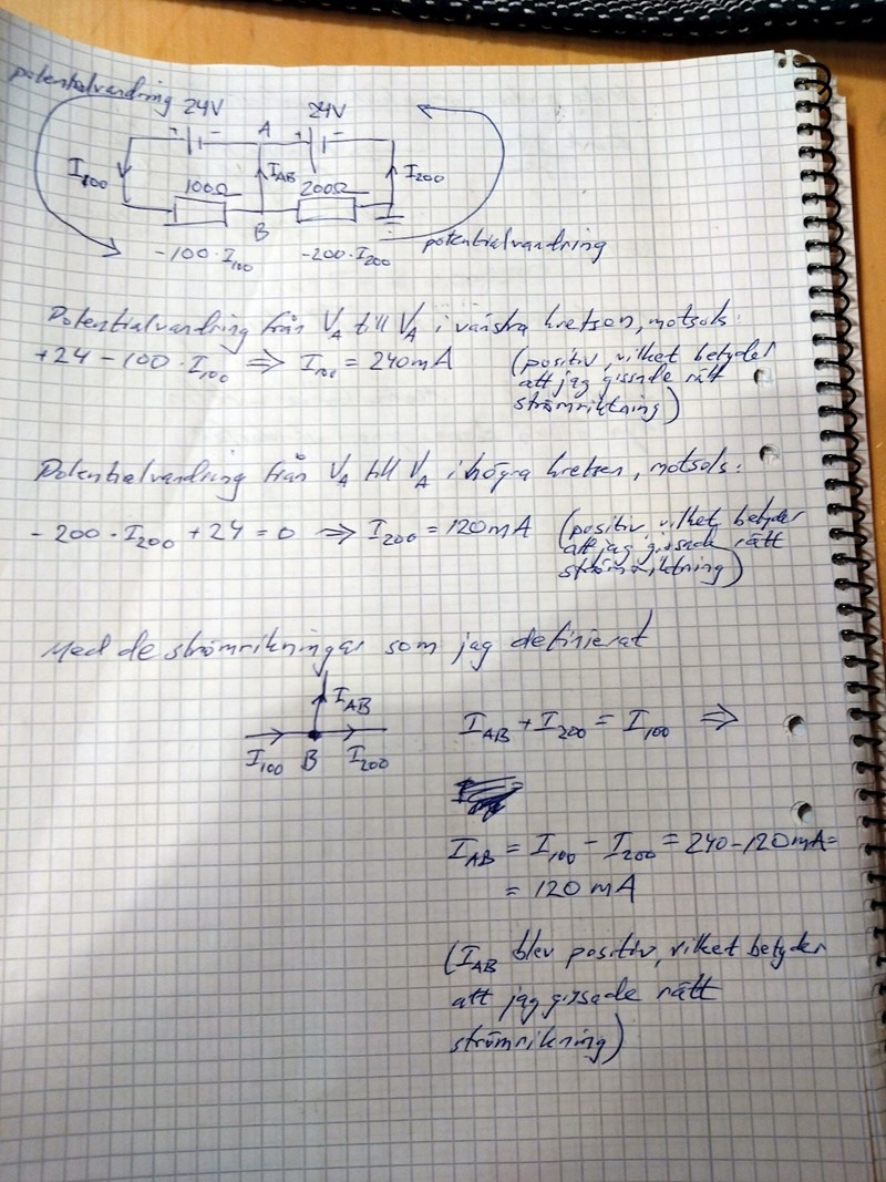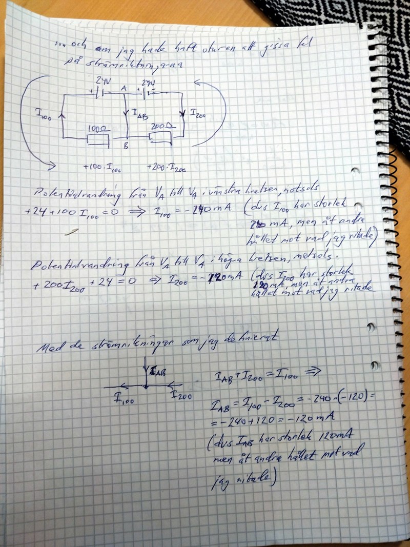 I mitt räkneexempel gissade jag att strömriktningarna skulle gå motsols i alla kretsar (och IAB skulle gå uppåt i figuren), vilket var rätt gissat, eftersom alla mina strömmar blev positiva. Det gör sedan när jag summerar ihop dem, att summan av IAB och I200 (som flyter från punkten B) måste vara lika stor som I200 (som flyter mot punkten B).