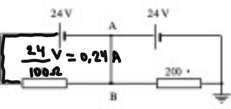 Så ser kopplingen ut eller vad det kallas, jag vet inte riktigt vart jag ska börja så jag skulle hjärtligen uppskatta lite vägledning :)) ( Frågan är bestäm strömmen genom ledaren AB) Det jag kan se är att det finns två batterier med 24 V och två resistorer , vad 100 och 200 står för vet jag inte och sen kan jag se att kopplingen är jordad? Använder man sig av Ohms lag?