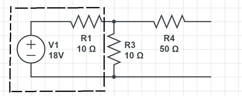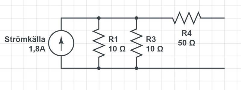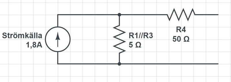 Då kan du ersätta det markerade området med en strömtvåpol istället, för att du ser att du har en spänningskälla i serie med ett motstånd. Det man gör är att man lägger till en strömkälla på 1,8A(). Resistorn har samma värde, fast du lägger den parallellt. Du får: