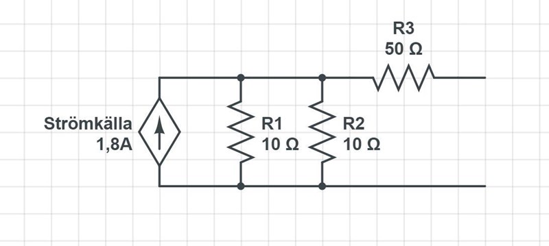 Jag tror att mitt problem är att jag tänker (tex med din uppritade bild) att det givetvis är 18V som är spänningen över R1 och R2, dvs strömmen blir 1.8 ampere genom vardera, men att jag då inte har någon aning om vad jag ska räkna med för spänning över R3 eftersom jag tänker att all spänning ''gick åt'' över R1 och R2.