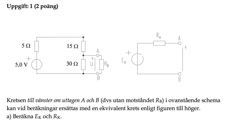 En fråga bara, när du räknar ut E (alltså Ek) så räknar du bara med 5 ohms motståndet. Hur kommer det sig, när E ska vara tomgångsspänningen och därav bör ju strömmen även färdas över 50 ohm motståndet, speciellt enligt det vi har ritat upp när vi lägger R-resultanten 5 ohm i serie med 50 ohm? I uppgiften jag bifogade senare så är ju lösningen annorlunda. Då tar de istället och räknar ut E mha E= 5*(30/(20+30)). Jag prövade att lösa ursprungliga uppgiften i denna tråden med den metoden men det fungerar ej.. Jag kan inte heller lösa den uppgiften med metoden du använt till uppgiften här! :( Vad särskiljer uppgifterna åt?