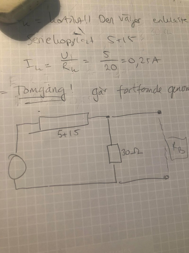 Oj råkade dubbla mitt svar där ovan. Men tror faktiskt jag fattar helt ok nu (peppar peppar!!) På uppgiften jag precis postade tänker jag alltså att jag först beräknar Ik och då kommer ju strömmen ta den lättaste vägen. Rb hade ingen belastning, dvs strömmen färdas genom 5 och 15 resistor ---> I=0.25A. Däremot för tomgång så tar ju strömmen alla tre vägar. Om jag då ritar en resistor 5+15 som Rk och sedan en resistor i y-led som 30 ohm så ser man ju faktiskt att man ska ta 5*(30/(5+15+30)) för att få fram E!