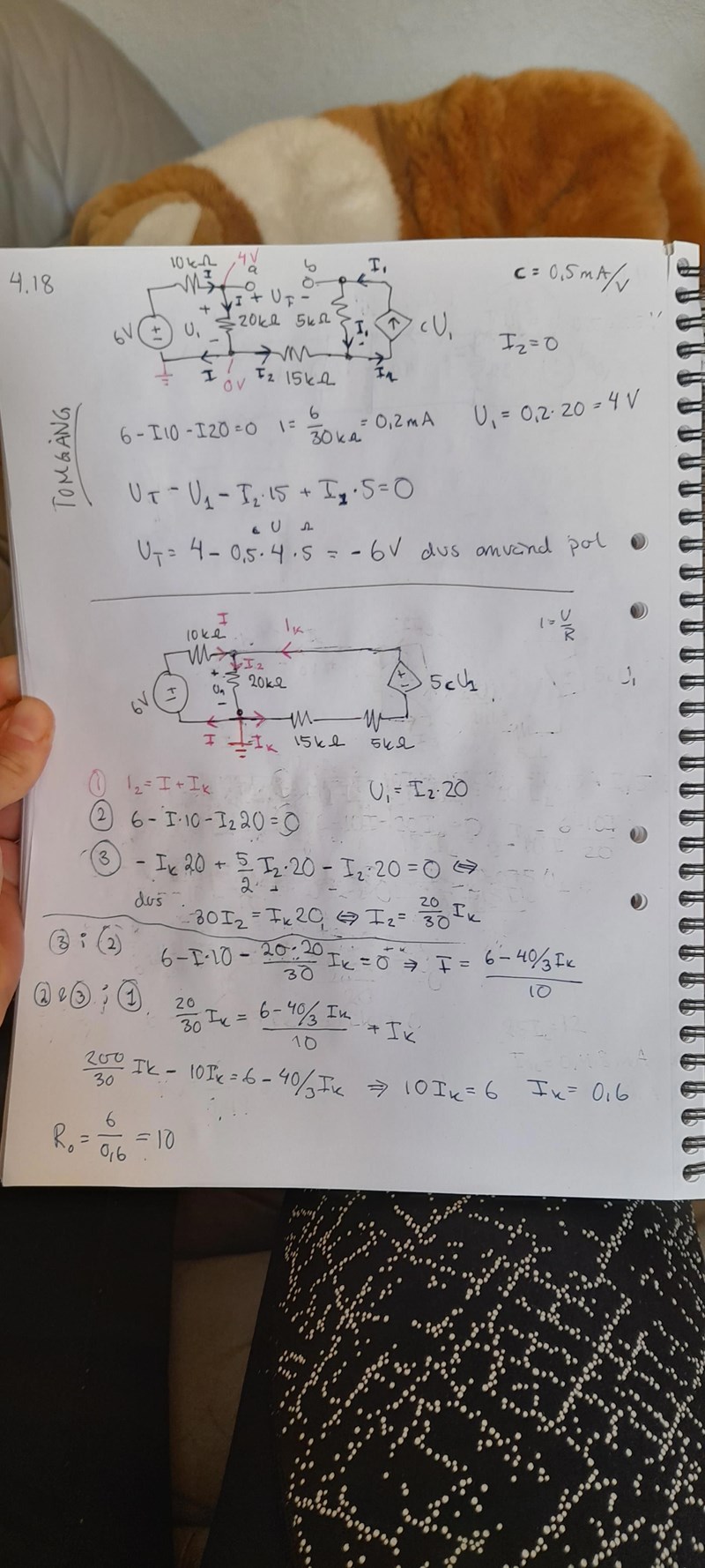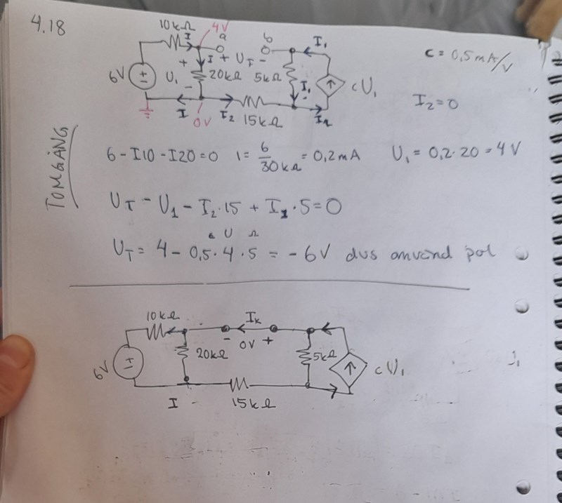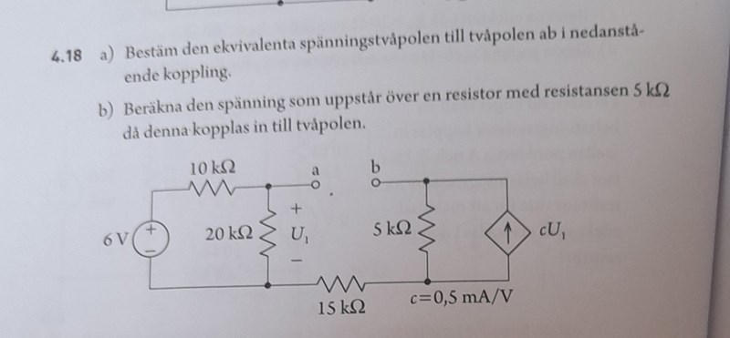 Det jag har gjort är att jag har beräknat tomgångsspänningen och försöker nu beräkna/ta fram kortslutningsströmmen, men förstår faktiskt inte riktigt hur jag ska tänka. Det ställer till det lite för mig när strömkällan är beroende och jag förstår inte riktigt hur jag ska tänka att strömmen går. Går det någon ström genom 20kOhms och 5kOhms resistorn vid kortslutning? Är kortslutningsströmmen samma som cU1? Är U1=6-10*Ik? Är strömmen genom 15kOhms resistiorn=Ik? (Jag har hållt på många timmar och fattar inte, svaret har jag men kommer inte fram till det) tack på förhand om någon vänlig själ skulle kunna förklara!!!
