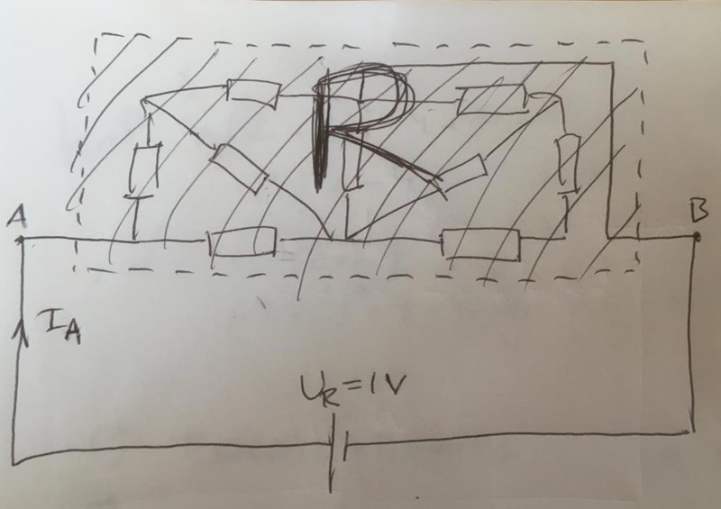 Antag att du inte vet någonting om ditt resistansnät, förutom att det bara består av resistanser. Betrakta då ditt resistansnät som en tvåpolig ”black box”. Vad är ett bra sätt att lista ut vilken ersättningsresistans som finns därinne om detta vore en laboration? Jo, det är att koppla på en liten mätspänning mellan A och B och se hur mycket ström som spänningen driver genom blackboxen. Ohm’s lag ger då ersättningsresistansen.