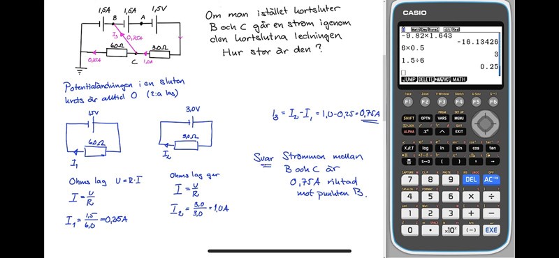 Frågan står uppe till höger. Lösningen är av Fredrik Lindmark. Längst ned i blått har han gjort två figurer som är delar sv kretsen. Notera vilken del av kretsen som är sträckan BC. I den vänstra går strömmen från B till C men i den högre går den från C till B. Hur är det möjligt? Dessutom i den högra figuren är U=3,0. Varför används inte också det batteriet som är till vänsters spänning så U=4,5?