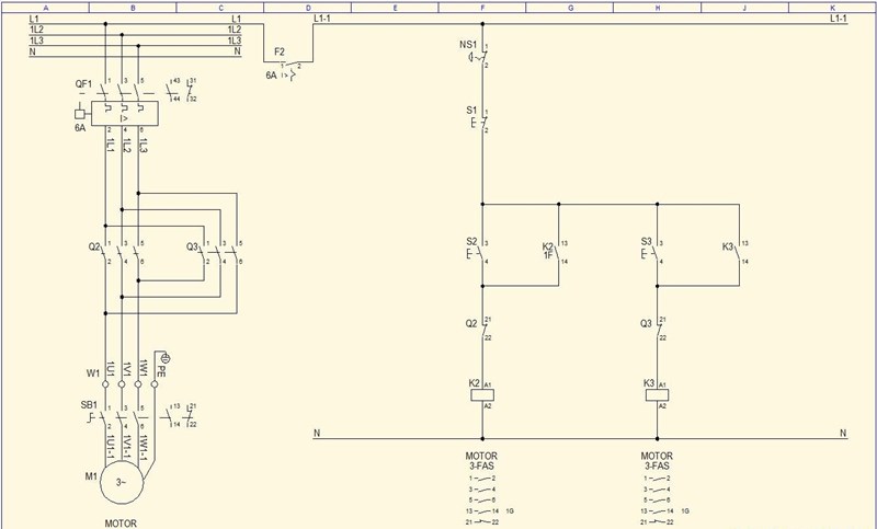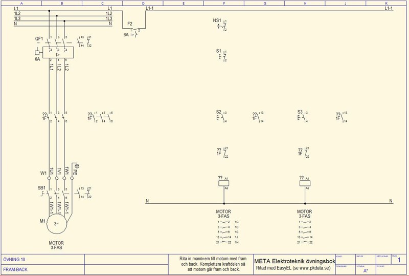 Ellära - Kretsschema, 3-FAS Motor fram/back. EasyEL.