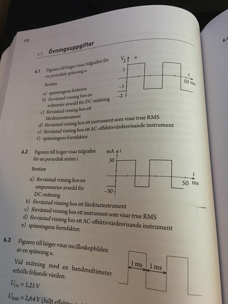 nja har gjort en del av uppgift 6.1, men det finns ingen frekvens uppgift (f=1/t). Och dc är direkt current men bara för jag vet vad det är (det är skapat av Tomas Edison) så betyder inte att jag vet hur man löser ut svart med hjälp av den. I uppgift 6.1 så är det hos en voltmeter och inte hos en amperemeter (ström).