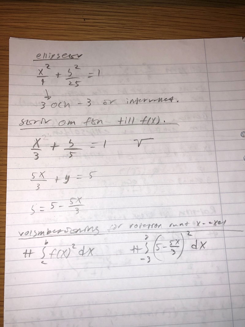 En ellips roterar kring x axeln och bildar på sätt en ellipsoid. Beräkna måttet av volymen som omsluts av ellipsoiden.