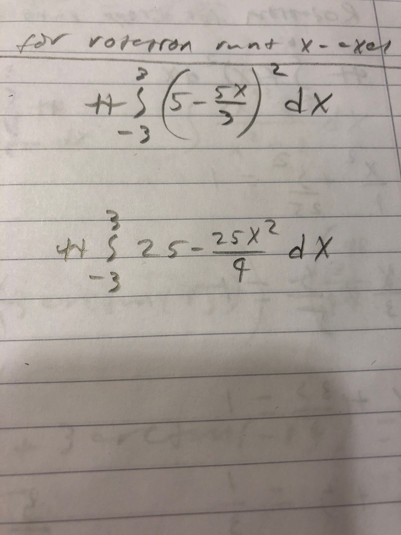 Jag har fastnat helt på en uppgift. Jag tycker det är väldigt svårt när inte uttrycket står i f(x) så man enkelt kan lägga in det i formeln. Jag fattar att Intervallet blir 3 och -3. Det jag undrar är att om man kan skriva om uttrycket till f(x). Som jag har förstått det så blir uttrycket 2 olika funktioner. På så sätt bildas en undre volym och övre så två intervall. 3 till 0 och 0 till -3.