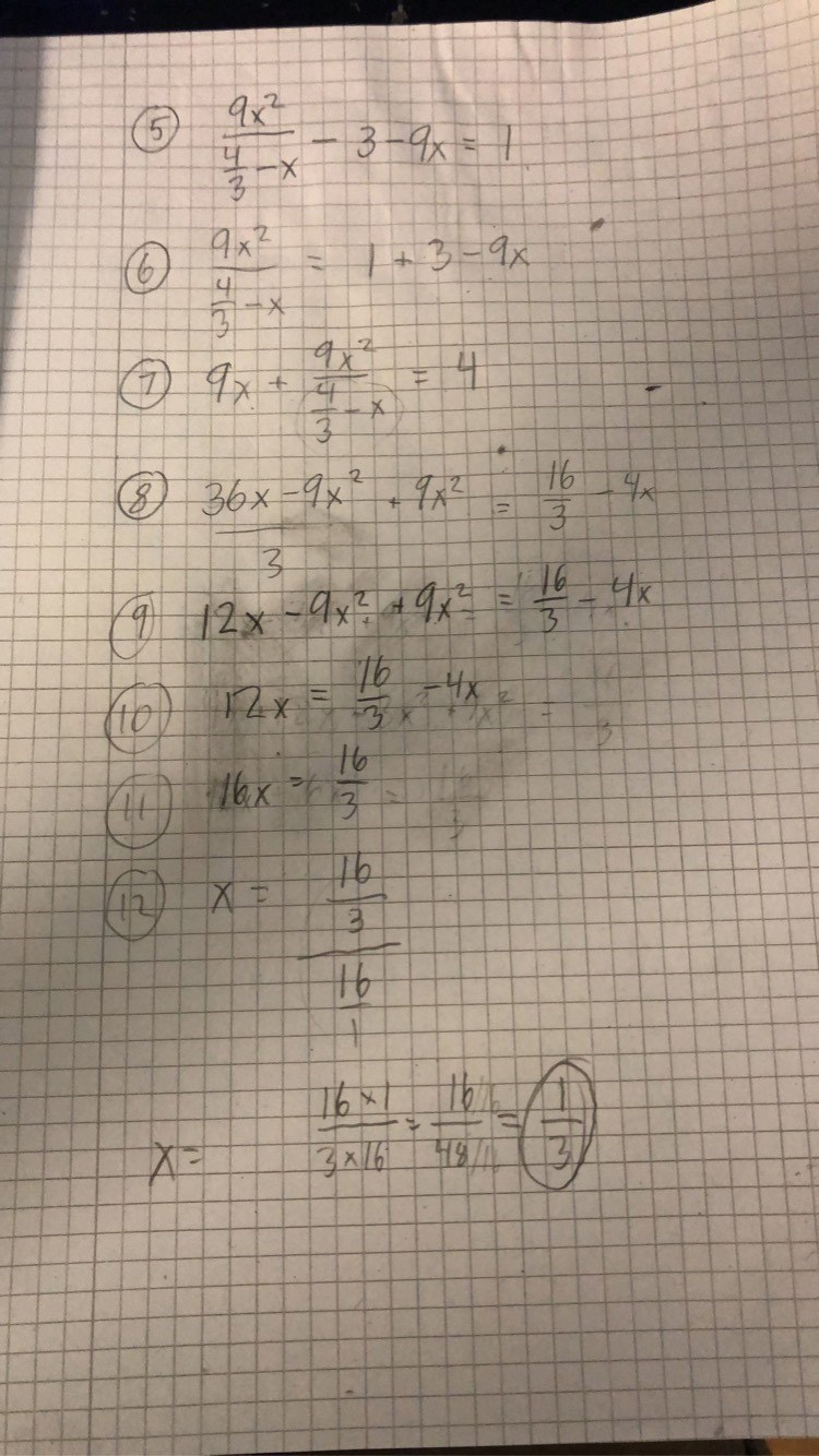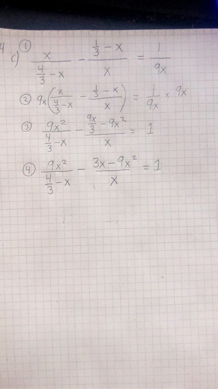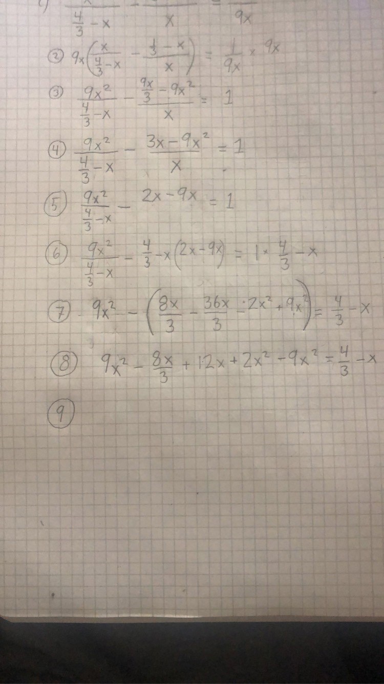 (3x-9x2)/x kan du förenkla. Sedan får du sätta allt i vänsterledet på gemensam nämnare igen.