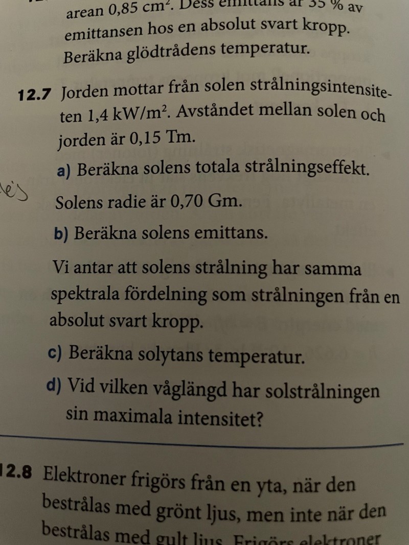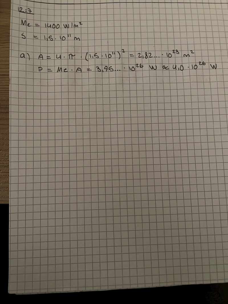 Jag har löst a) i uppgiften som ni ser på bilden. Ni ser min lösning på den andra bilden. Förstår dock inte varför man använder avståndet mellan jorden och solen som radie när man räknar ut arean. Arean när man räknar med emittans motsvarar väll arean av den ytan som sänder ut strålningen? Då borde man väll räkna med solens radie?