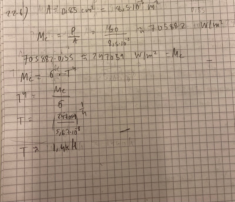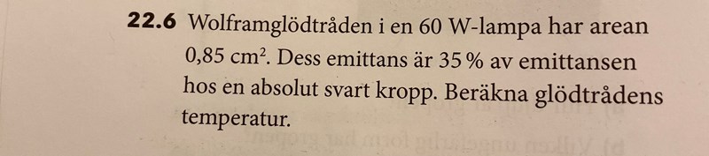 Tack så mycket för hjälpen! Det är väll såhär du menar? Innan jag skulle försöka lösa uppgiften så var jag osäker om man skulle multiplicera eller dividera med 0,35. Men sen tänkte jag att om jag dividerar med 0,35 så beräknar jag väll emittansen hos en svart kropp? Det är väll ej det jag vill beräkna då jag ej har en svart kropp. Jag får dock rätt svar så undrar bara vad det är jag har missförstått isåfall. Tack så hemskt mycket ytligare än gång för hjälpen!