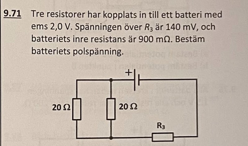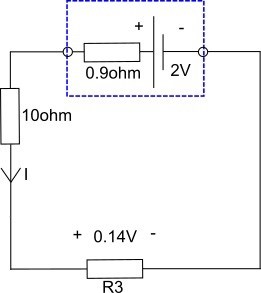 Nu har du en seriekopplad krets med 2V ems, 0,9 ohm, R3 och 10 ohm.